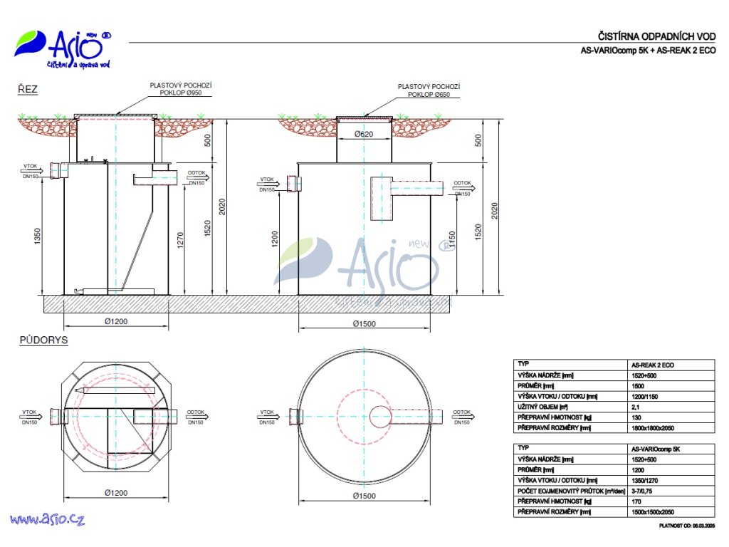 Celková výška 2020 mm. Hmotnost 170 kg. Vtok i odtok je upraven na připojení na PVC DN 150 mm.